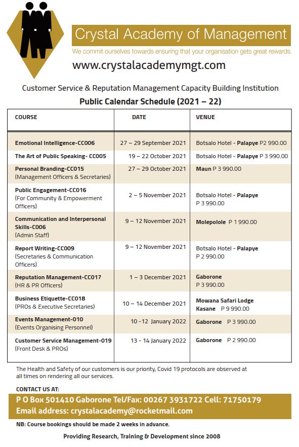 CRYSTAL ACADEMY OF MANAGEMENT 2021-22 TRAINING CALENDER