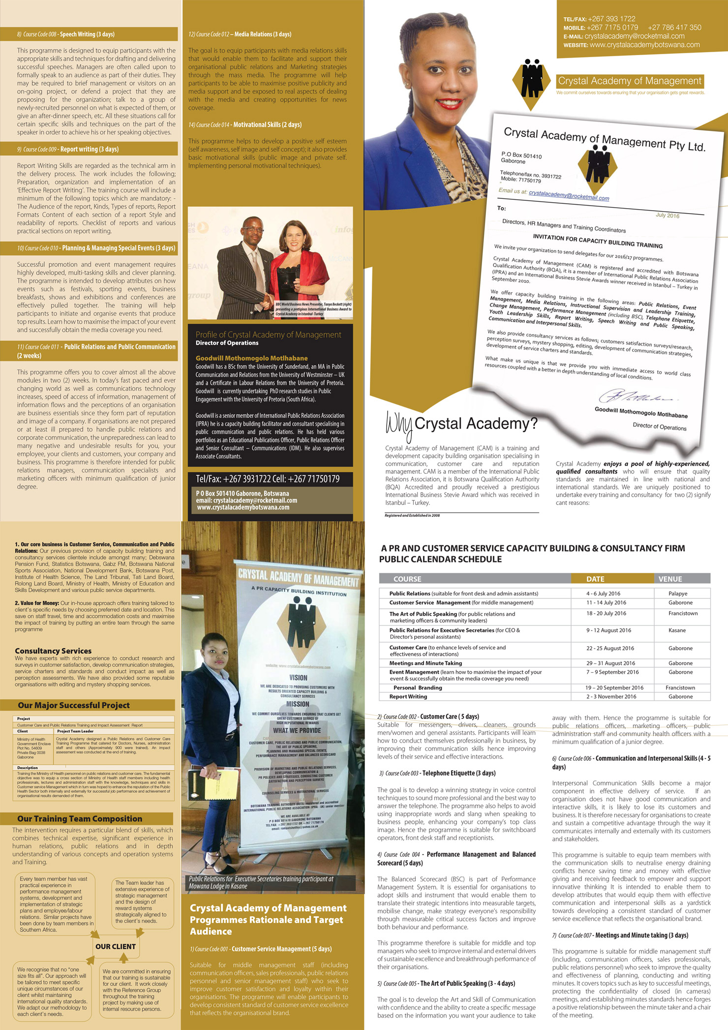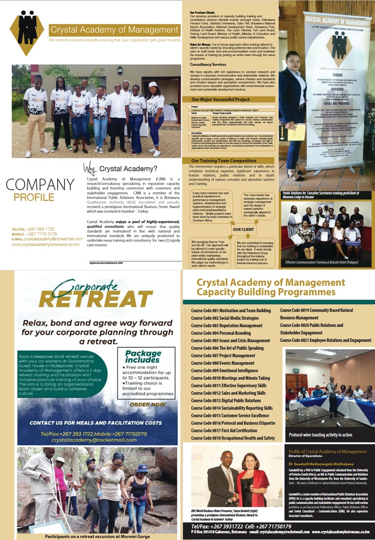 ii) Developing a Customer Service Charter and entrenching Cultural Change PREVIOUS CLIENTS; Debswana, Mascom Wireless, Statistics Botswana, Gabz FM, Botswana National Sports Association, National Development Bank and various Public Ministries and Departments CRYSTAL ACADEMY TEAM LEADER; Is an experienced Capacity Building Programmes Developer and Facilitator. His highest qualification is MA in Public Communication and Public Relations obtained from Westminster University (UK) and he is due to complete a PhD Thesis in Public Engagement through the University of Pretoria.