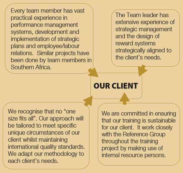 Training the Ministry of Health personnel on public relations and customer care. The fundamental objective was to equip a cross section of Ministry of Health staff members including health professionals, lectures and administration staff with the knowledge, techniques and skills in Customer service Management which in turn was hoped to enhance the reputation of the Public Health Sector both internally and externally for successful job performance and achievement of organisational results demanded of them.